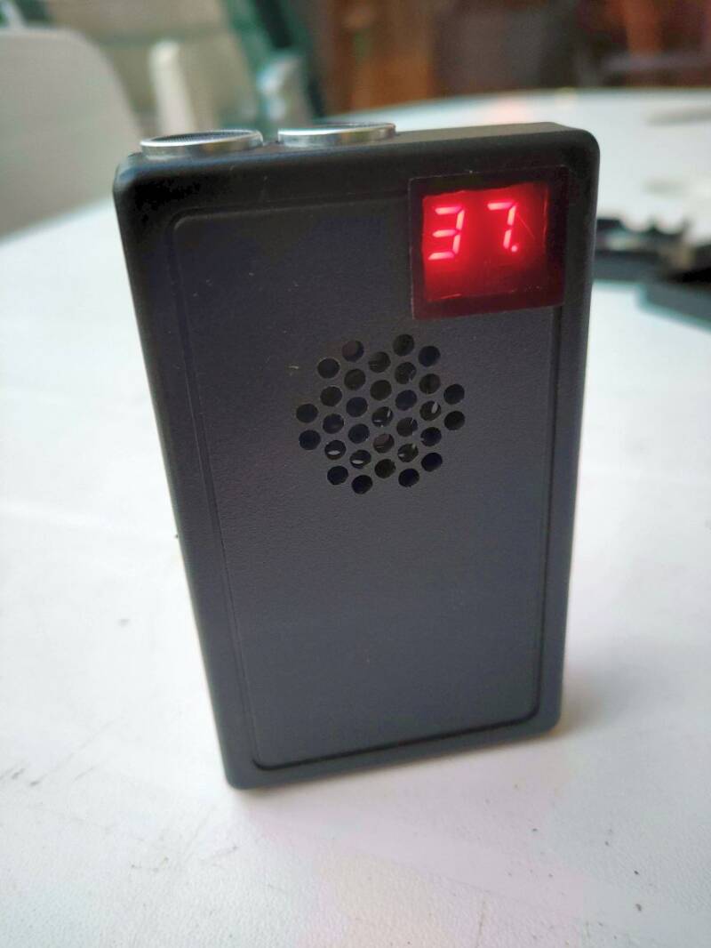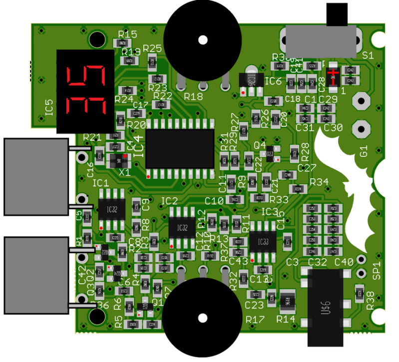 The enclosure is 103x63x26 which makes it a nice compact unit, on the new design we also have an extra ultrasonic transducer (for lower frequencies) the first ones only had 40kHz transducer and there also is a headphone connector. (The headpones connector probably is not in the most convenient place but as you can see the board gets a bit crowded.