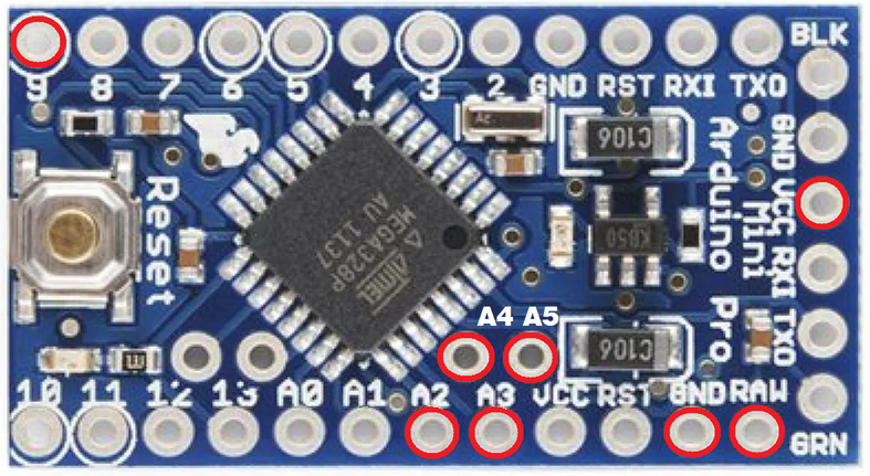 I used this style Arduino Pro Mini (8Mhz), only the red pads are used. 3.3V for the microphone and amplifier some from the Arduino VCC pin ,battery voltage input is on pin RAW