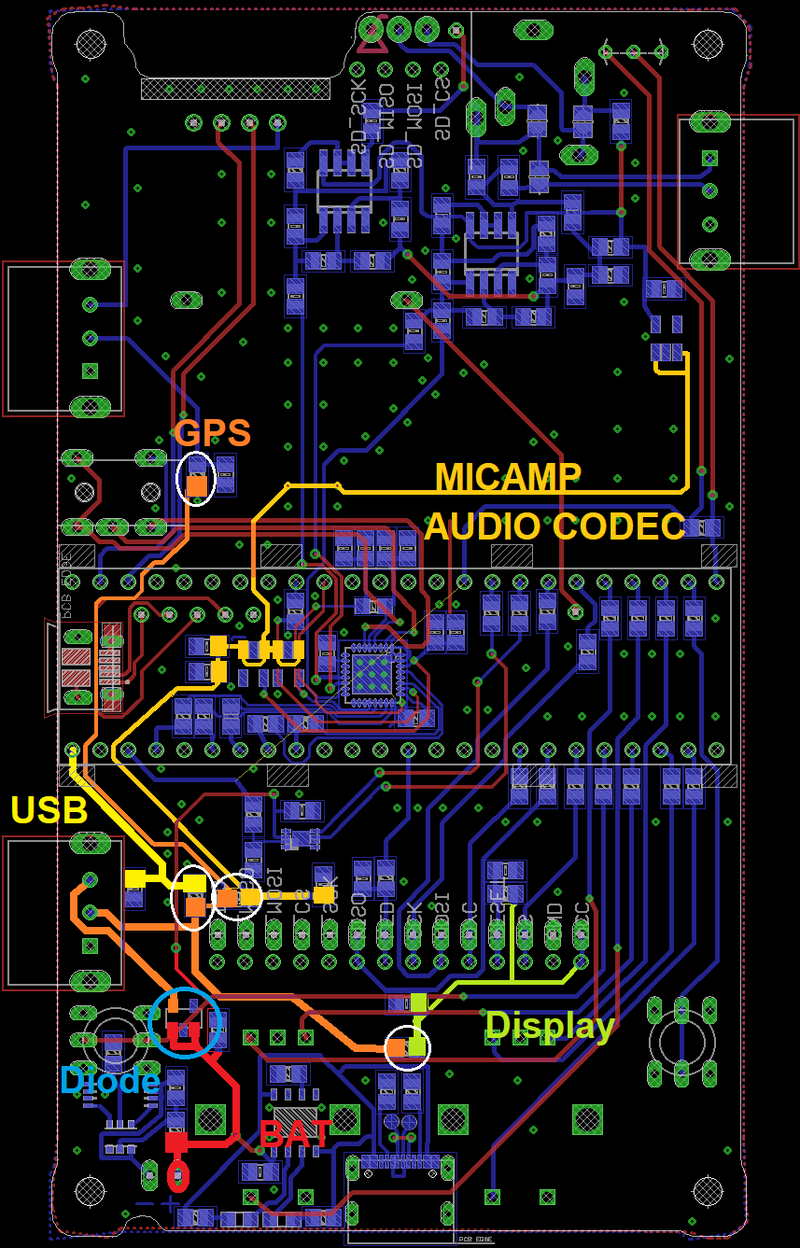 The image below shows the distribution of that battery voltage with the power switch on. To lessen noise and add some protection most parts have their own LC-filter. If the battery voltage is too low, a protection circuit disconnects the negative (GND) from the battery. Make sure the battery is at least partly charged if you want to check the battery voltage on the different circuits or power via the micro-USB on the Teensy.